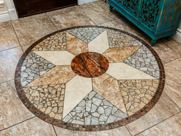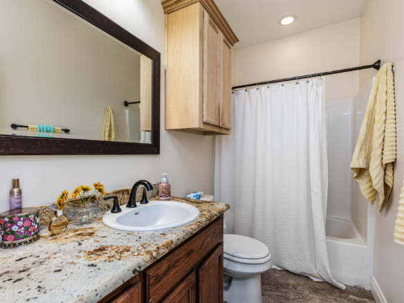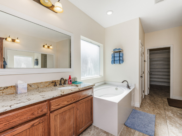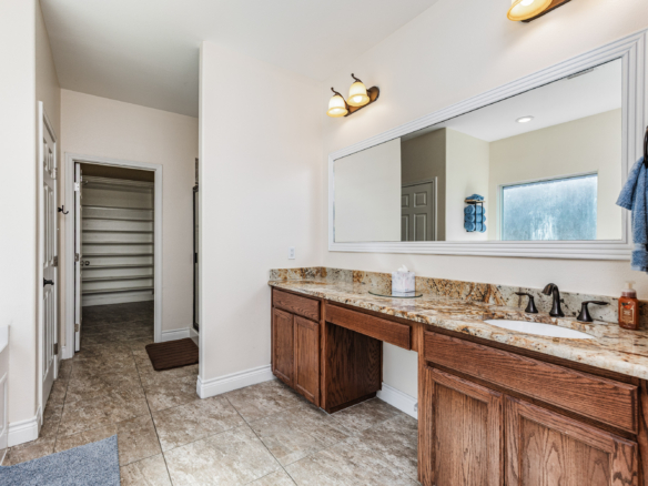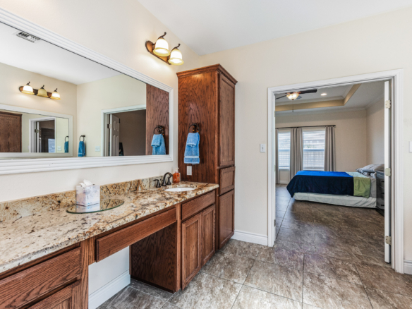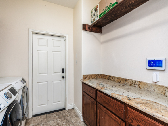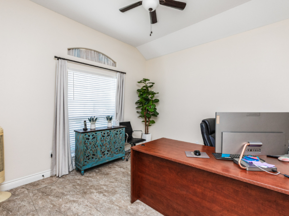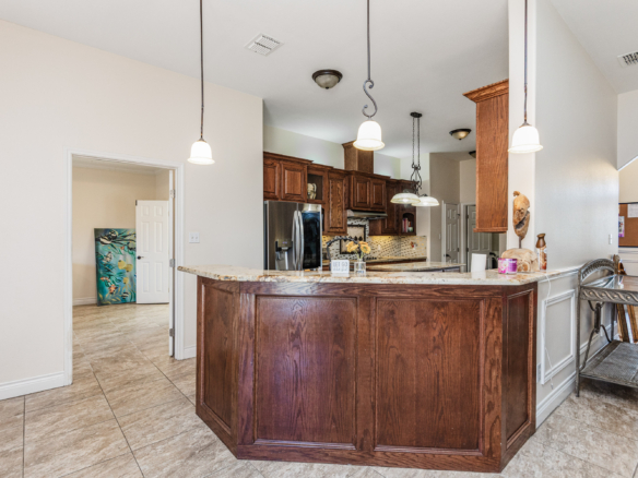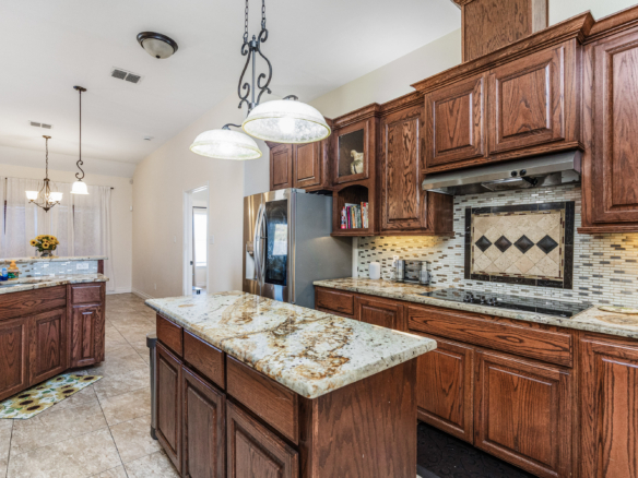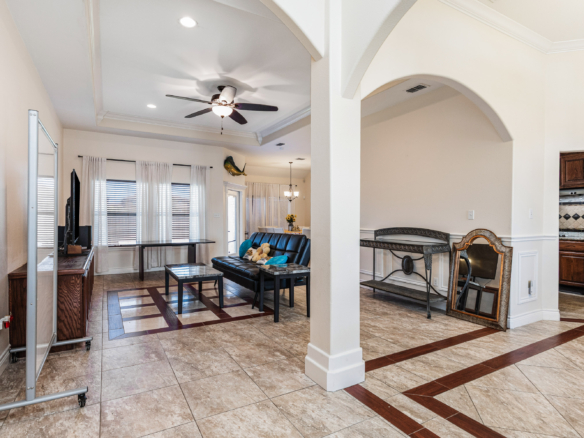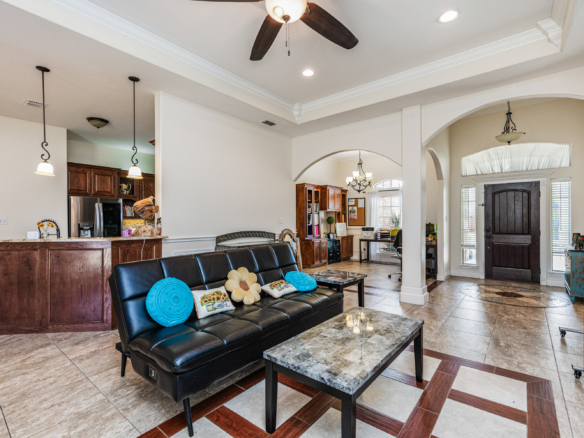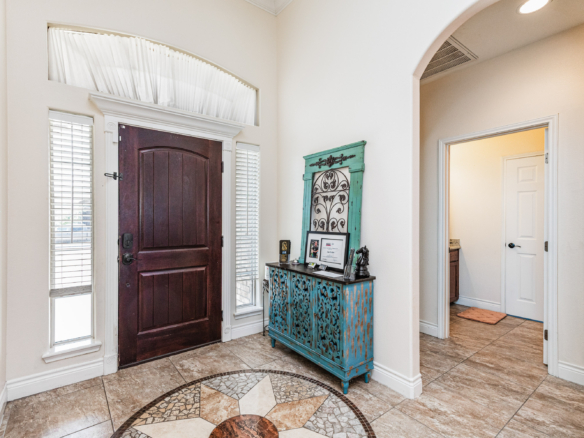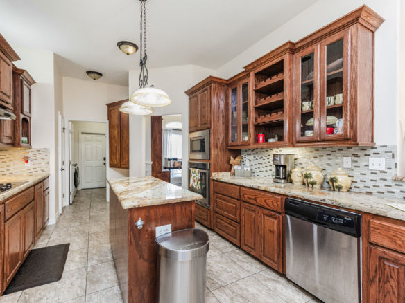 Executive home that mixes style, elegance, and comfort for a enjoyable living experience. Come home to this gorgeous living space in the Manhattan Estates. Enter the home through the front arched entry to decorative inlaid tile in the front foyer to the living area. The home features an open concept floor plan and split bedrooms. Bedroom four has a full bath. The elegance in this home continues in the kitchen with inlayed tile motifs, glass mosaic backsplash, stainless appliances, custom glass front cabinets, wine rack, oil rubbed bronze fixtures and hanging pendant lighting. Granite counters and kitchen island provide plenty of room for entertainment and family gathering. A spacious principal bedroom features raised ceiling, large walk-in closets with built-ins. Bathroom features double vanities, a spa tub, and separate shower with decoratively inlaid mosaic tile. Energy efficient windows open inward for cleaning. Beautiful living in elegant style and comfort!!